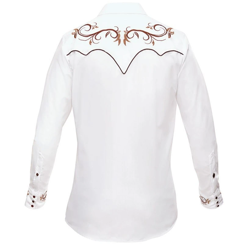 - Camisa blanca moda vaquera de manga larga y corte entallado Rafael Amaya Western Style by Ranger’s, adornada con bordados de estilo mexicano color marrón ocre con ramas y flores en pecho, espalda y puños, y vivos decorativos a juego.