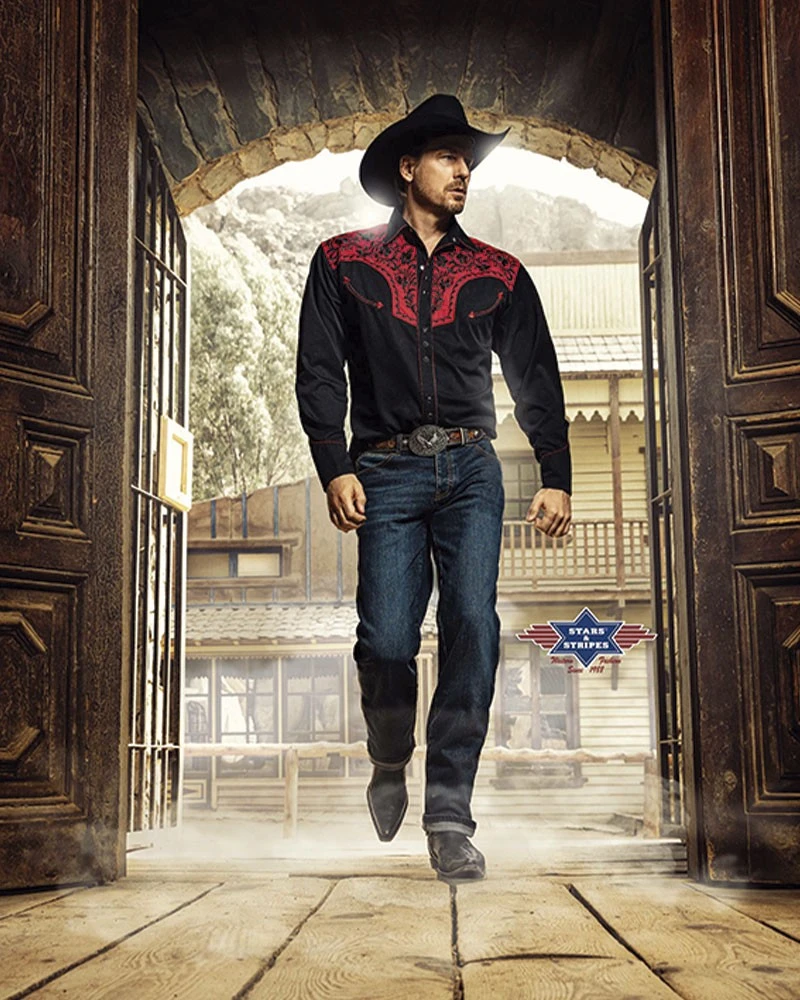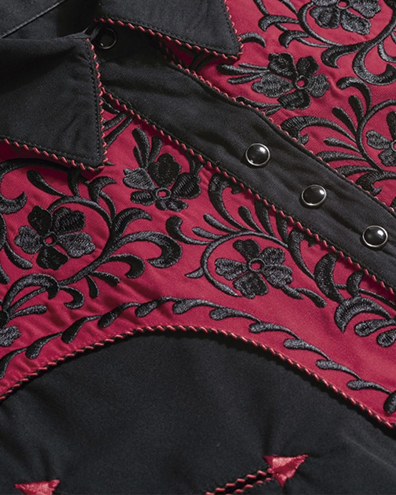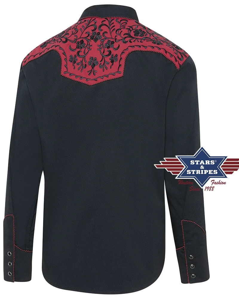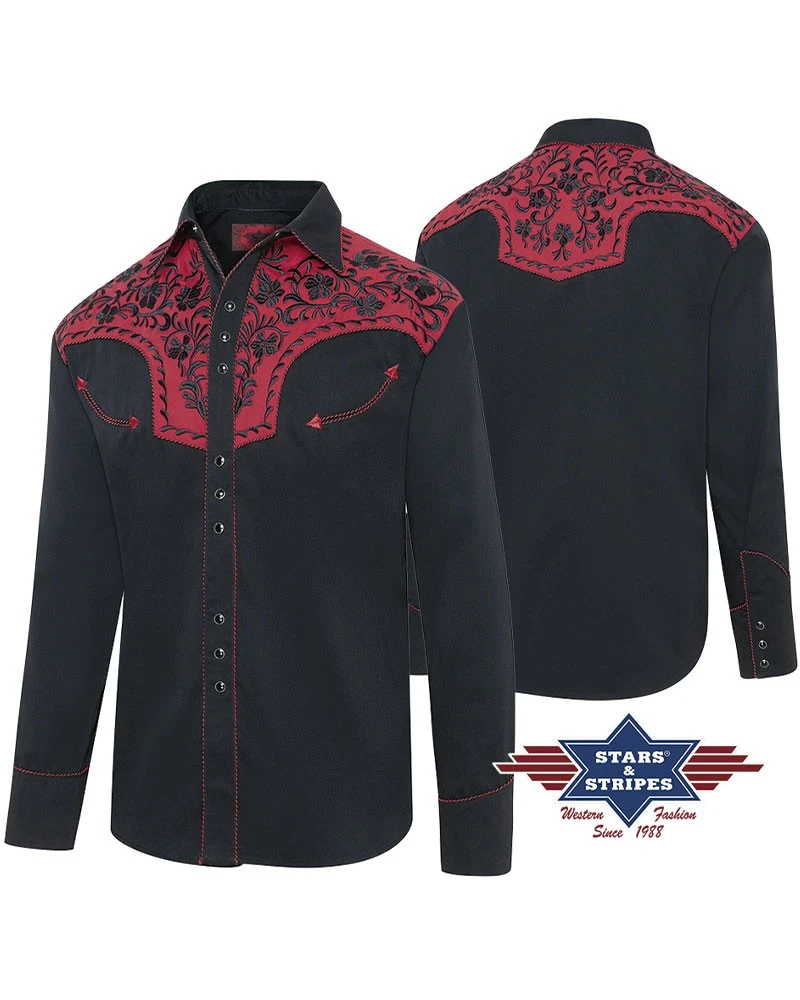 - Camisa negra western para hombre de manga larga y corte entallado Stars & Stripes, decorada con un vistoso canesú color rojo bermellón con un detalladísimo bordado negro de estilo floral tanto en el pecho como en la espalda. En los vivos también se observa el trenzado entre el hilo rojo y negro para crear una mayor sensación de profundidad en la camisa.