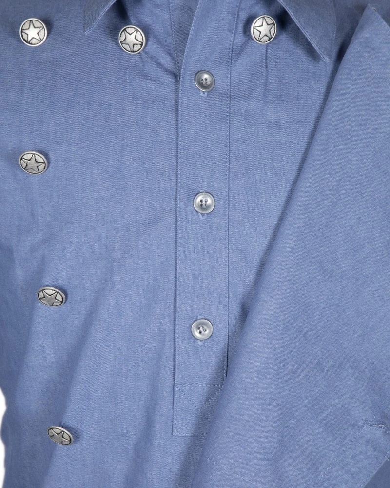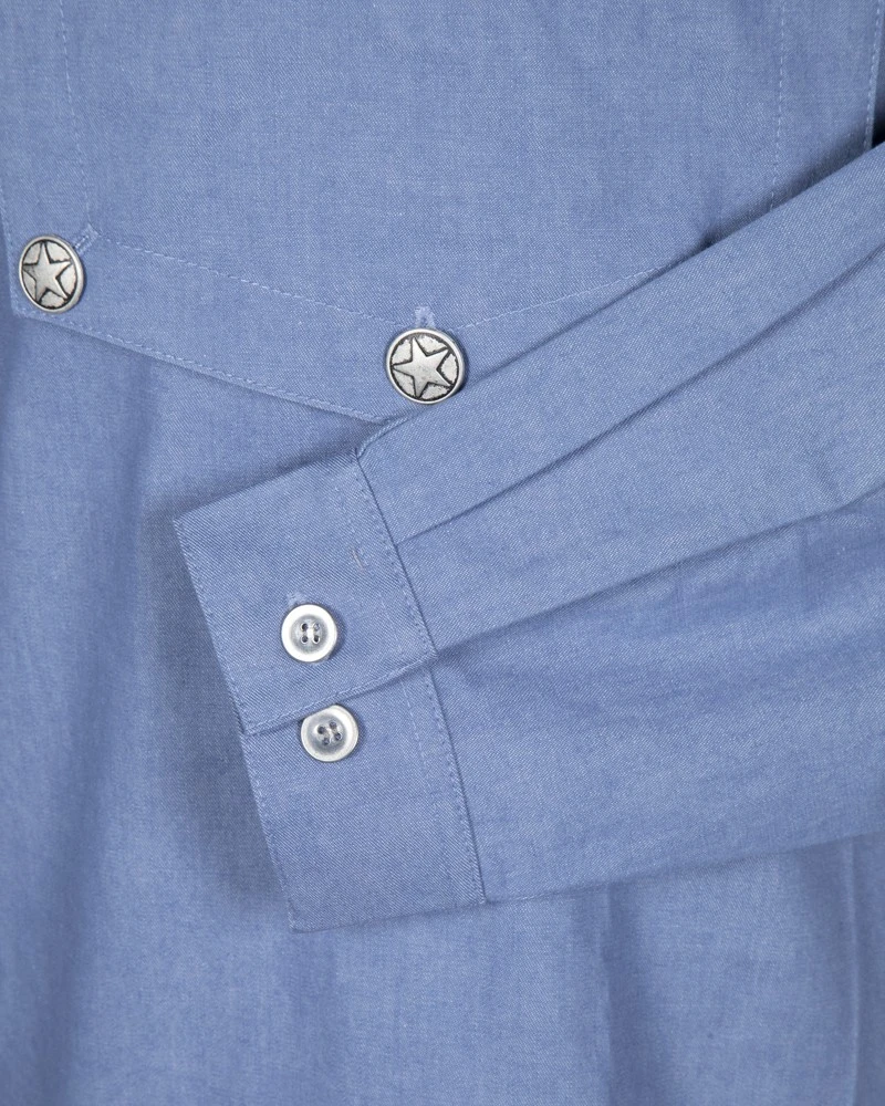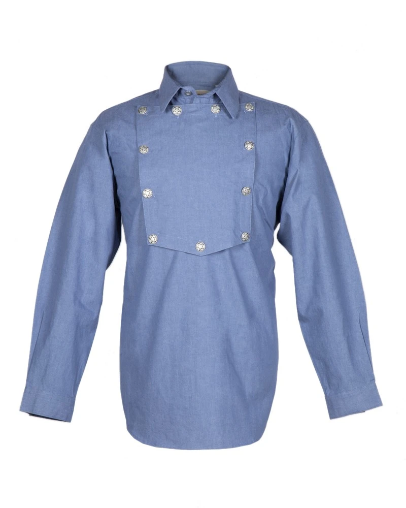 - Llevando esta estupenda camisa western de mezclilla con peto frontal color azul claro seguro que te confundirán con un auténtico pistolero cowboy, ya que se trata de una prenda estrechamente relacionada con el mundo vaquero, pudiendo ser utilizada para recreaciones relacionadas con películas del Oeste o de la Guerra Civil Americana, espectáculos western, obras de teatro o rodajes, disfraces de cowboy o también como artículo de coleccionista.