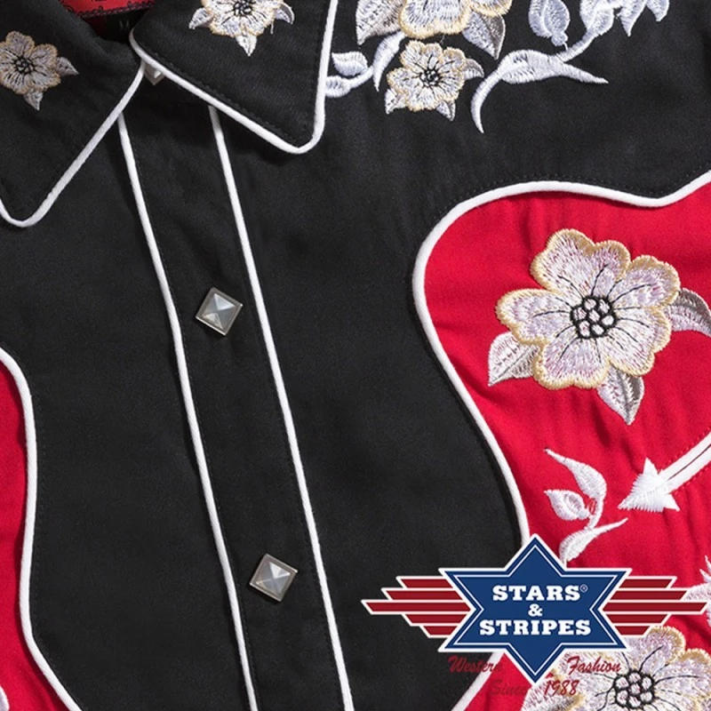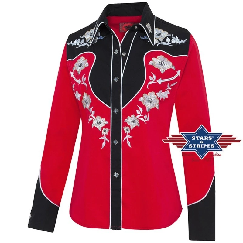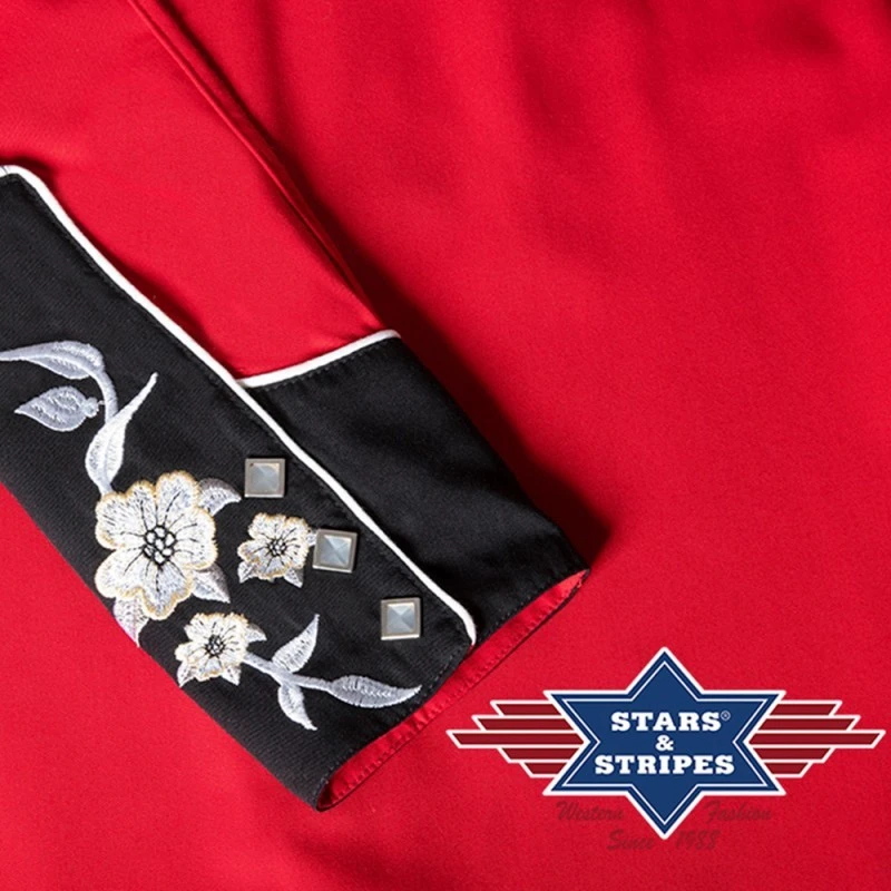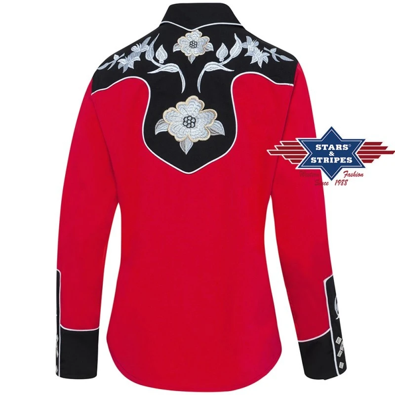 - Camisa color rojo moda western para mujer Stars & Stripes con canesú negro ondulado con caída hasta el ombligo, decorada con muchos bordados de flores y hojas en hilo blanco y dorado repartidos de manera equilibrada en la parte frontal y trasera, incluyendo en los puños negros a juego con el canesú y el cuello de la camisa. Los vivos blancos ayudan a realzar la sensación de profundidad entre los dos colores primarios.