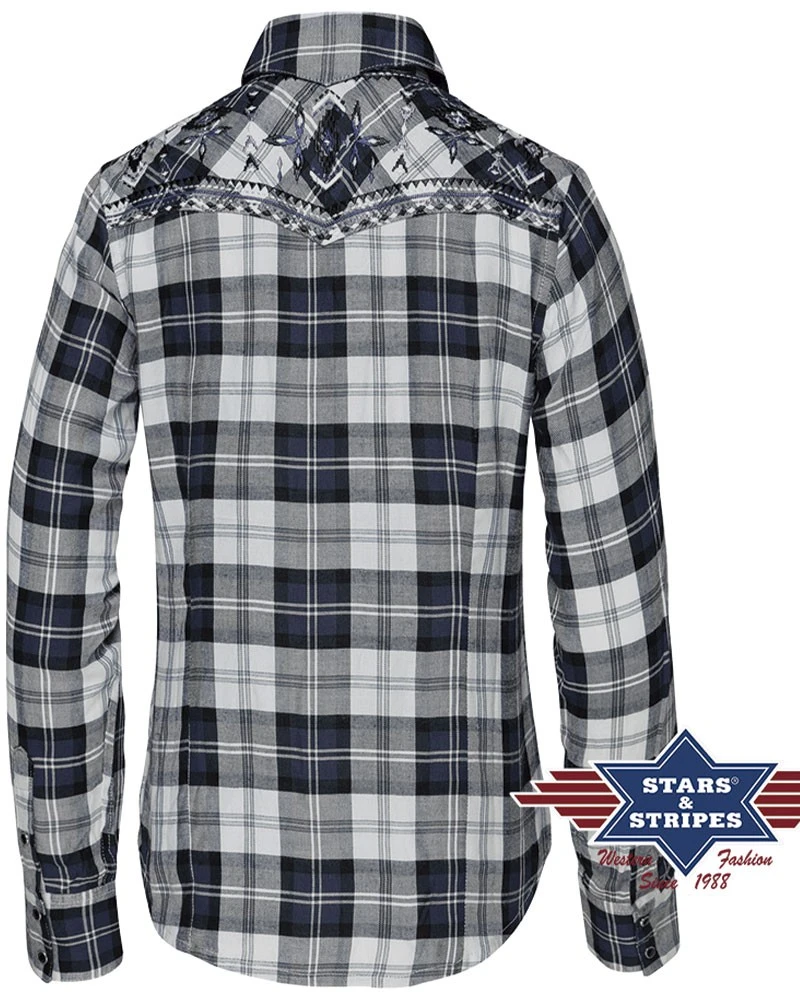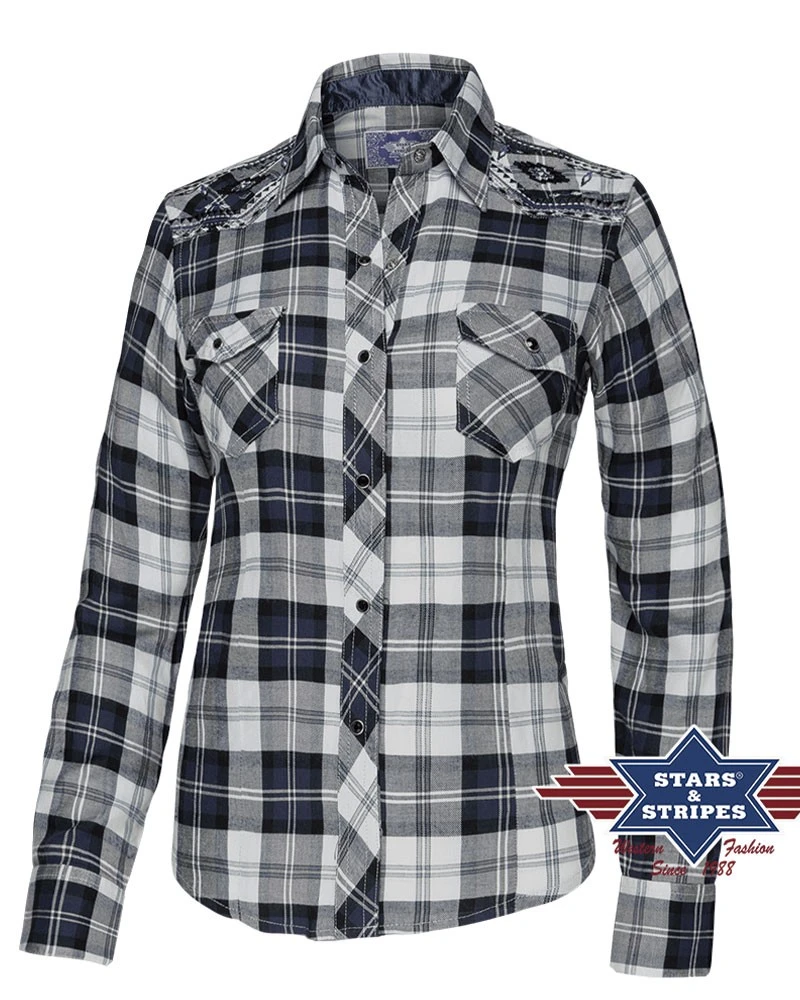 - Para quienes estáis en esa delgada línea que separa el mundo vaquero de la estética boho, no os hará falta moveros de allí, vistiendo esta fantástica camisa de manga larga para mujer de Stars & Stripes, a cuadros blancos y color azul jeans, con franjas blancas y grises, bordada además con coloridos mosaicos inspirados en el arte navajo.