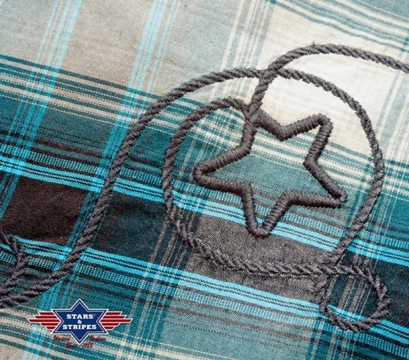 - Sé la estrella de tú próximo baile, cowgirl, y dale frescura a tu look estrenando esta fabulosa camisa a cuadros color arena y negros de manga corta, donde las franjas en color verde turquesa le aportan un toque vistoso y muy estival.