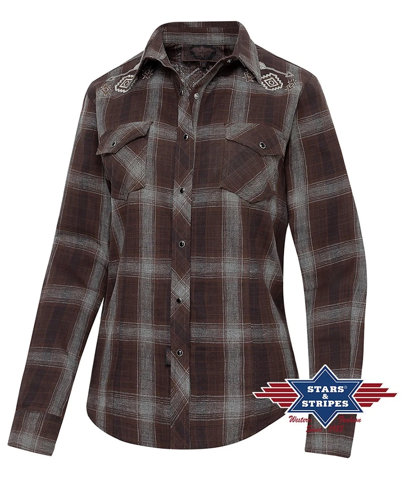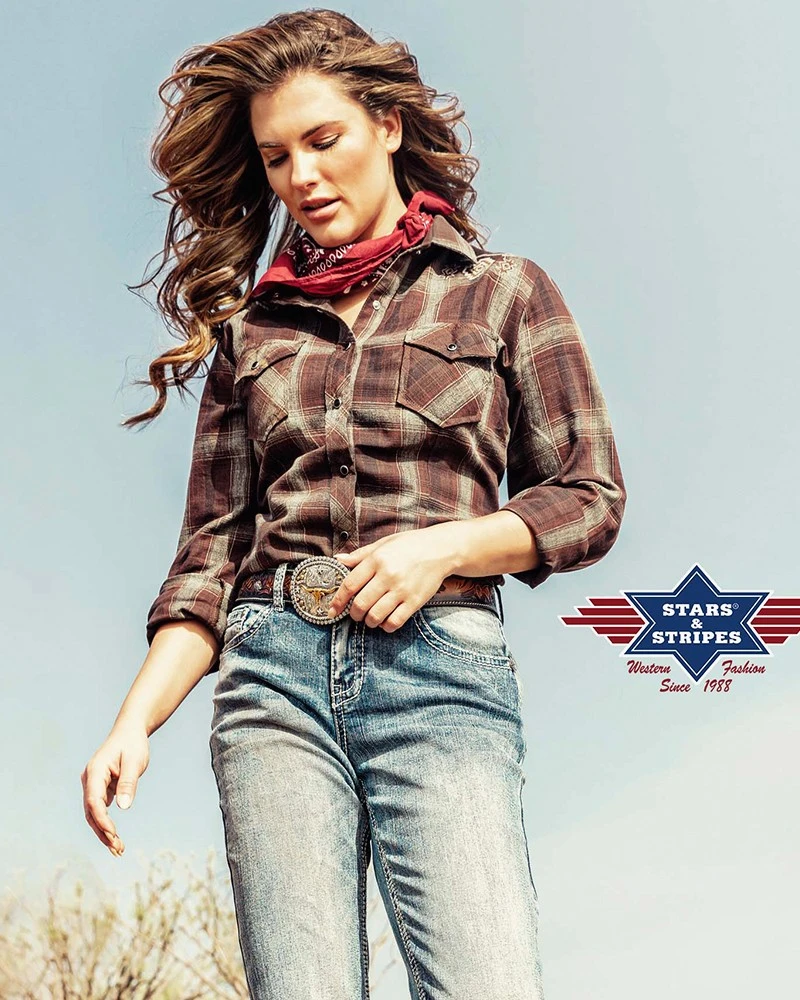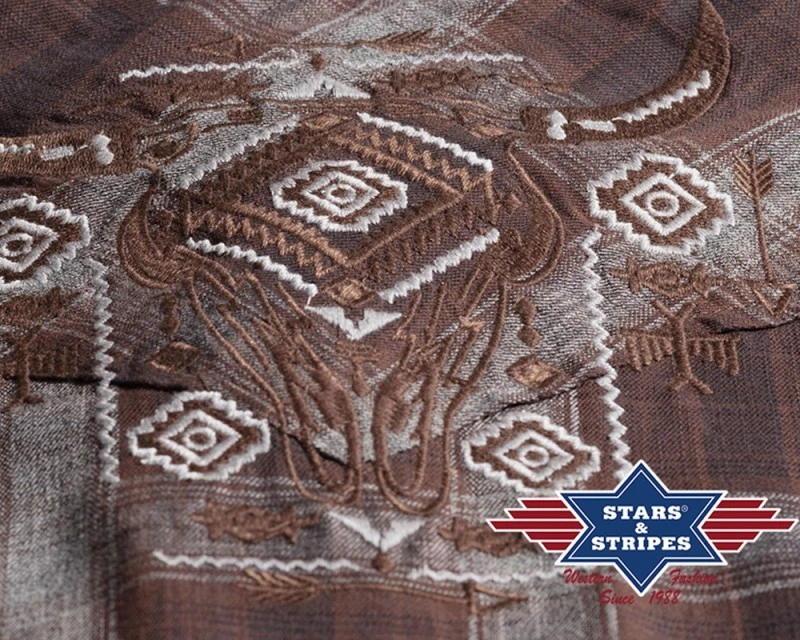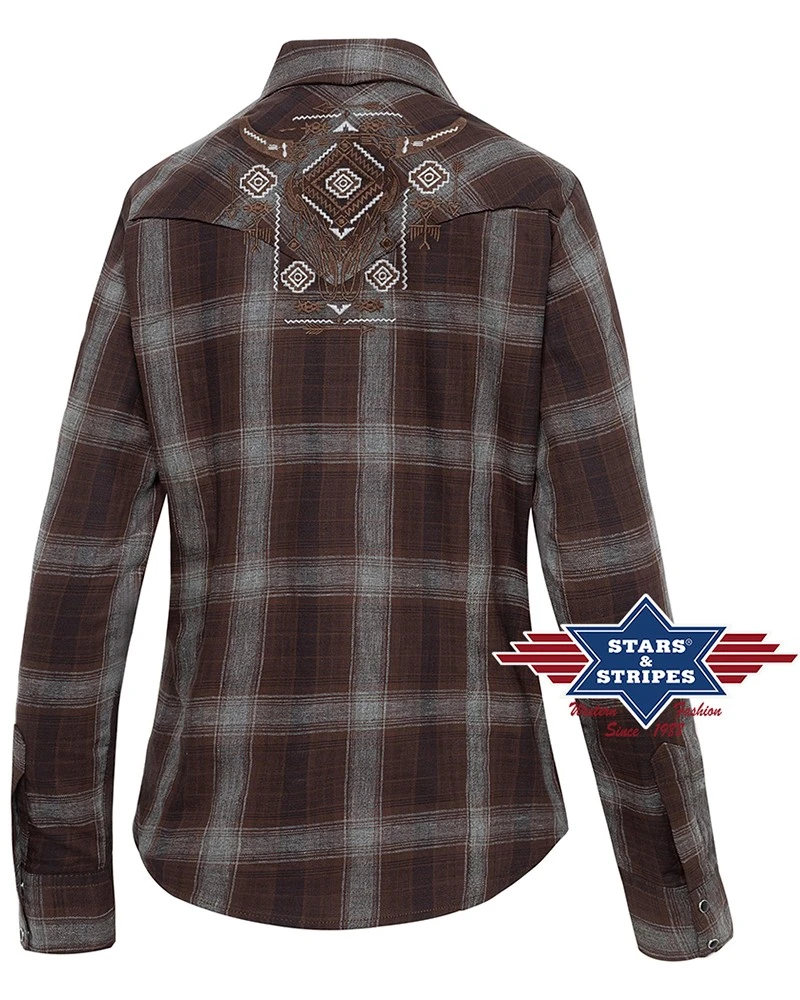 - Camisa Stars & Stripes para mujer de manga larga y corte recto estilo vaquero, con cuadros marrones, franjas grises y varios bordados de estilo azteca, donde destaca una calavera de búfalo en la parte trasera.