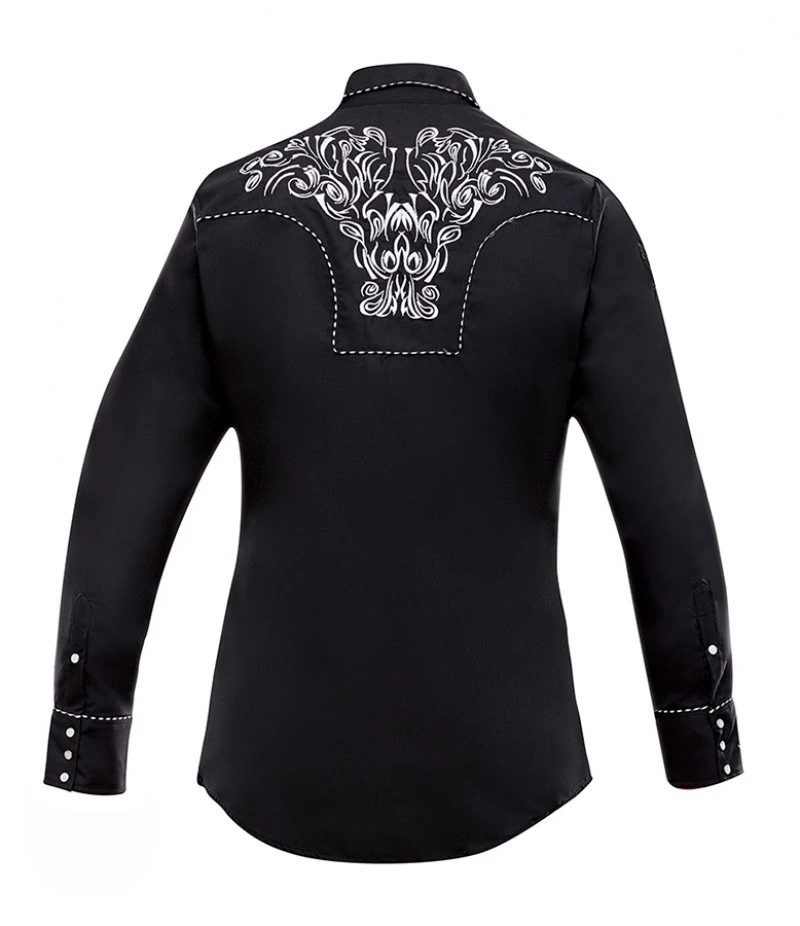 - Esta camisa negra para hombre destaca por la calidad y minuciosidad de los bordados blancos que lucen pecho, espalda, mangas y puños, algo muy inusual de ver salvo en modelos genuinamente western. Los vivos de la camisa son tricolor (blanco, gris y negro), realzando todavía más todos sus detalles.