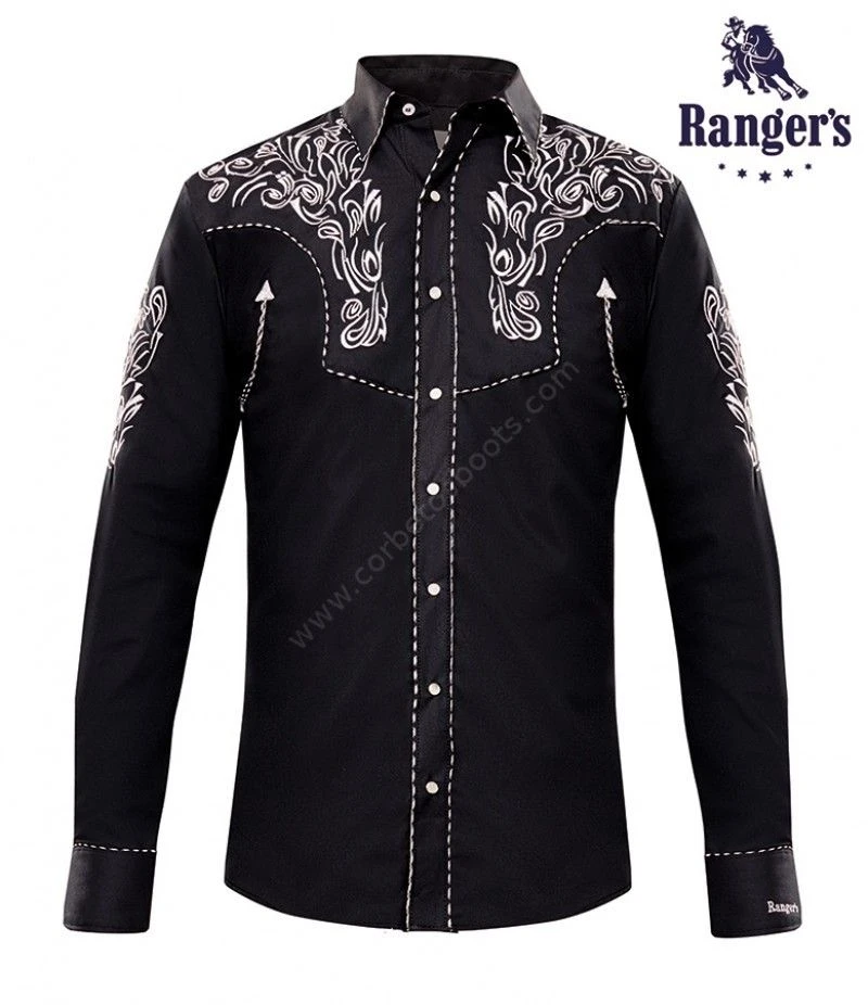 Camisa Ranger’s Vaquera Para Hombre Negra Con Recamado Blanco
