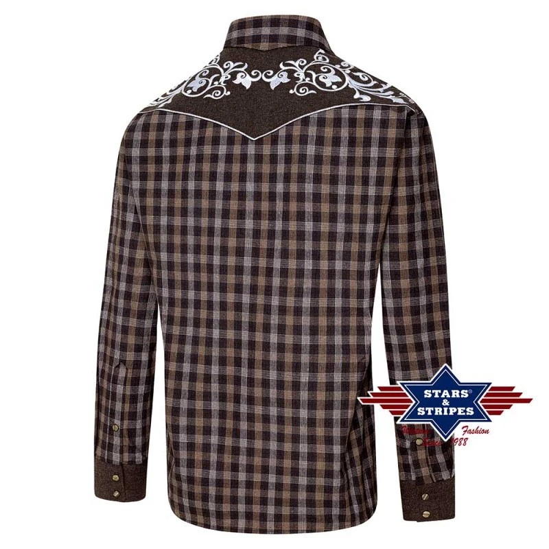 Camisa Vaquera Marrón A Cuadros Canesú Aterciopelado Con Bordado Floral Blanco Para Hombre