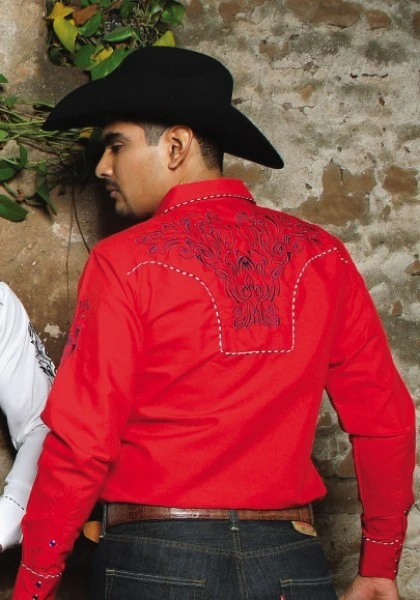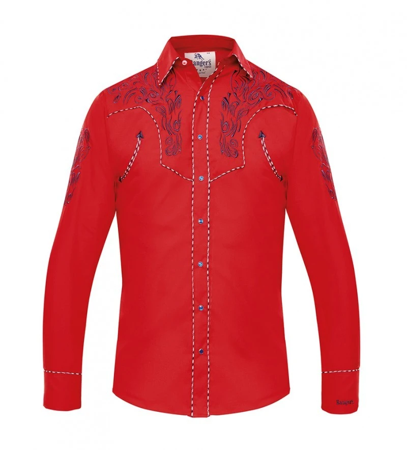 - Camisa color rojo de manga larga y corte entallado estilo cowboy Ranger’s para hombre, con un diseño tribal en azul marino bordado por toda la pechera, hombros y parte superior de la espalda y decorada con vivos tricolor.