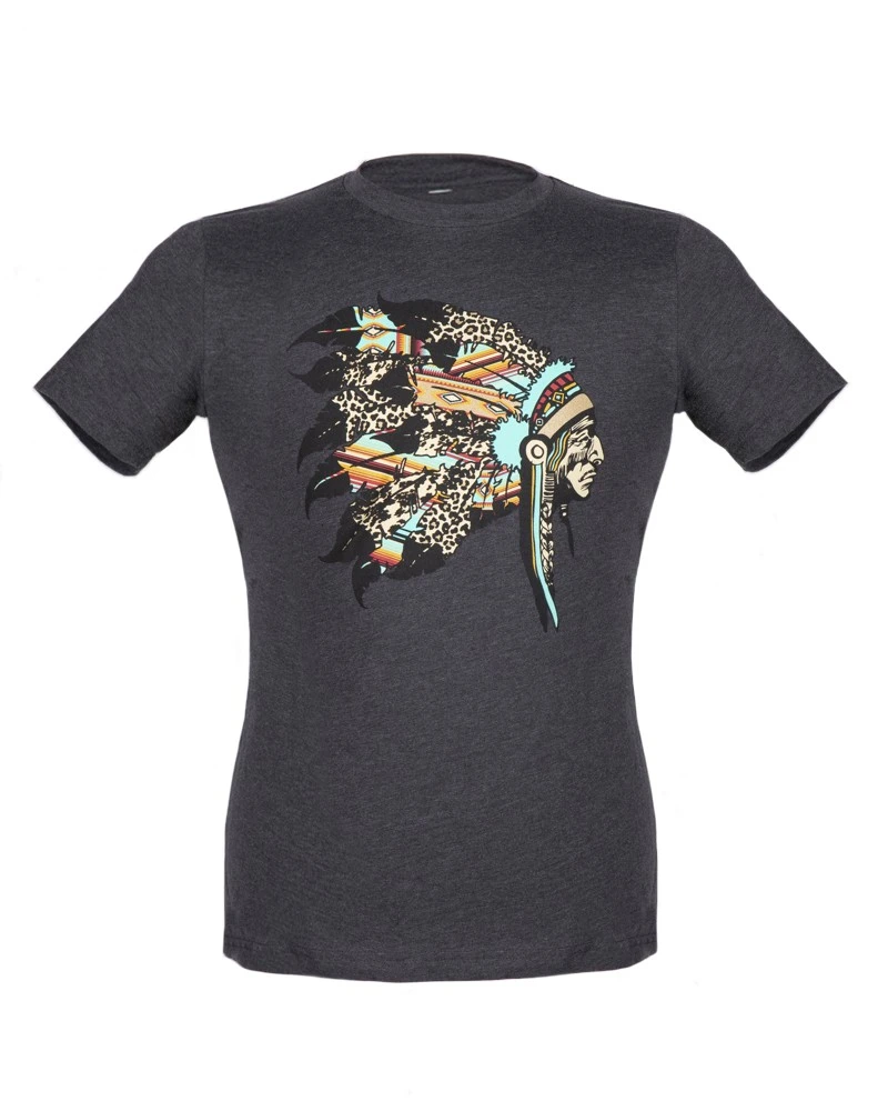 - Camiseta color gris estilo western de cuello redondo para hombre y mujer, con dibujo de perfil de un jefe nativo americano llevando un penacho adornado con varios estampados de mosaicos y printings animales.