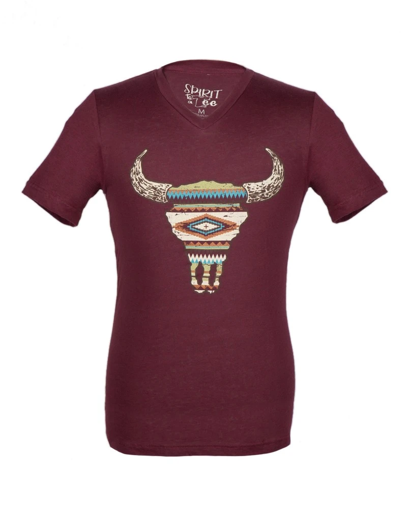 - Camiseta color granate envejecido estilo western con cuello en pico para hombre y mujer, con dibujo estampado muy detallado del contorno de una calavera de vaca con varios mosaicos de colores en su interior.