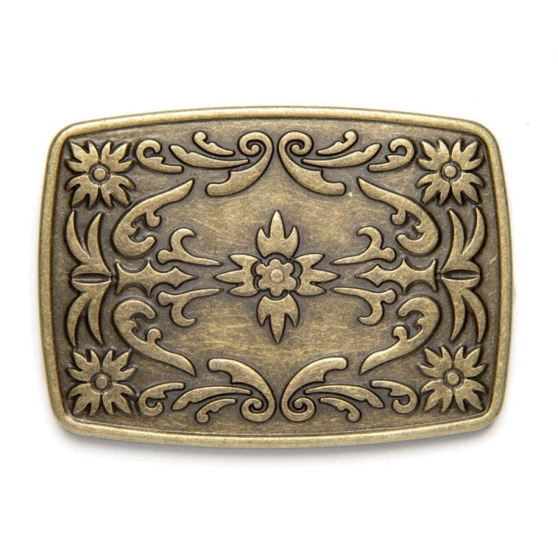 - Hebilla metálica rectangular de brillo dorado envejecido y peso ligero con un grabado simétrico en relieve de diseño tribal western con flores en el centro y los extremos.