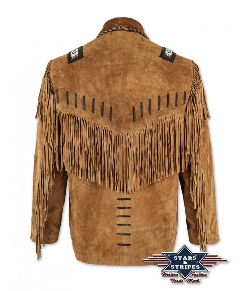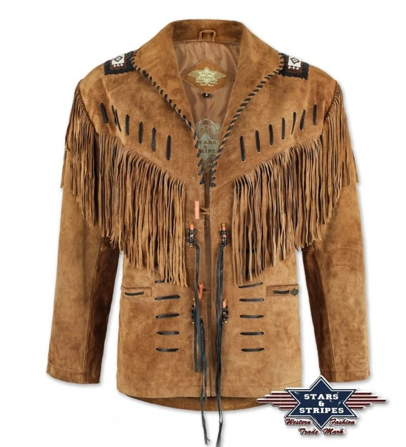 - La espectacularidad de esta chaqueta western de piel girada marrón con flecos en el pecho, mangas y espalda solo se puede comprobar probándotela, con todos los detalles que se le pueden pedir a una prenda tan característica en el mundo cowboy: pasados decorativos de cuero, mosaicos de estilo nativo americanos hechos con cuentas blancas y negras encima de los hombros y cierres artesanales de madera, además de incluir dos bolsillos exteriores y uno interior con cremallera.