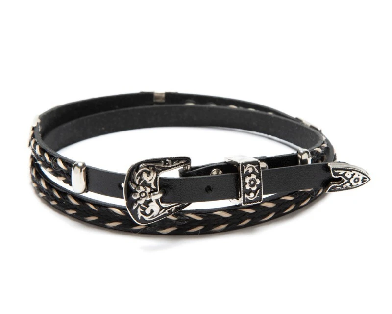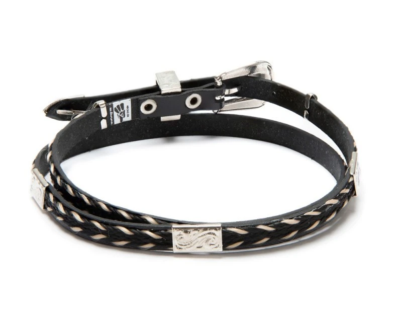 - Cinta de cuero negro con trenzados de hilo negro y claro que imitan la crin de caballo para sombrero vaquero y clásico, con chapas rectangulares decorativas grabadas y juego de tres piezas con hebilla, pasador y punta metálica con grabados florales y fondo negro.
