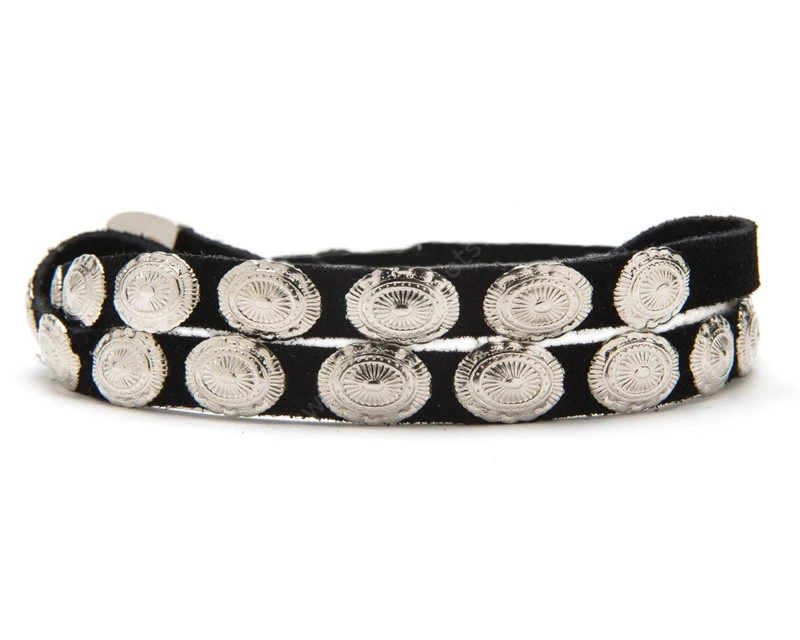 - De tacto muy agradable y muy fácil de colocar, esta cinta para sombrero de estilo cowboy hecha en ante negro está adornada con una gran cantidad de conchos vaqueros ovalados.
