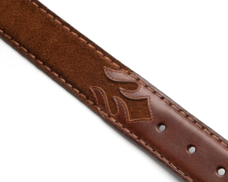 - Cinturón estilo vaquero para hombre y mujer Original Belts hecho con doble capa superpuesta de cuero vacuno, combinando ante marrón en la zona central y la punta con diversas cenefas de piel semibrillante color coñac, con trabilla de ante del mismo tono y hebilla metálica clásica de aguja.