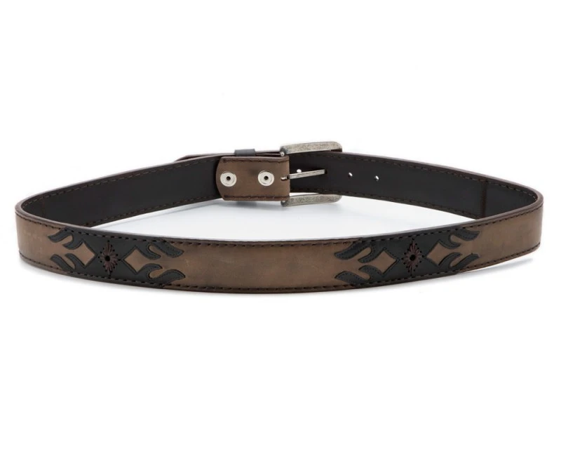 - Cinturón estilo western para hombre y mujer Original Belts hecho con doble capa superpuesta de cuero vacuno marrón engrasado, cenefas tribales de piel negra y pasados de hilo marrón en forma de mosaico, trabilla negra y hebilla metálica clásica de aguja.