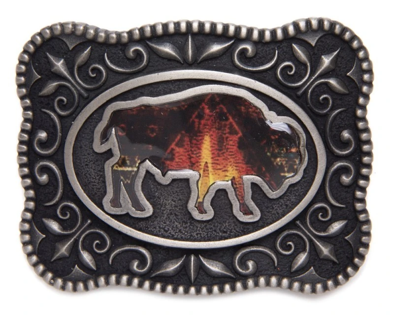 - Hebilla western rectangular de aspecto envejecido y ligeramente ondulada para hombre y mujer, decorada en el centro con la figura de un bisonte de perfil, en cuyo interior rojizo y negro se intuyen las llamaradas de una hoguera. El contorno exterior metálico está adornado con relieves en forma de flor de lis.