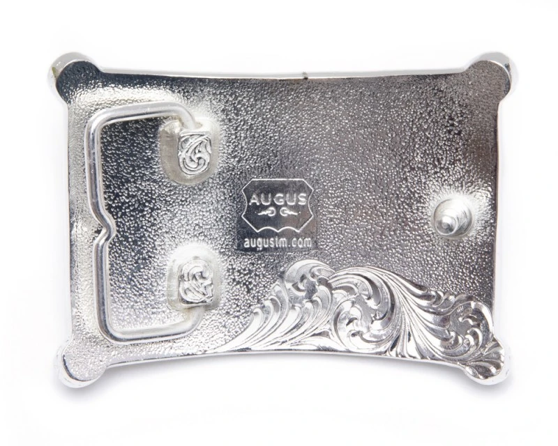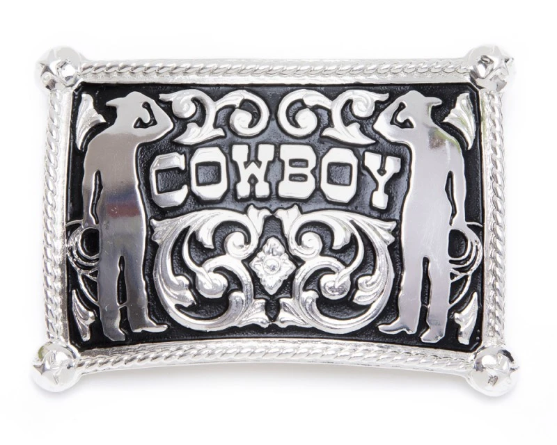 - Hebilla rectangular de estilo western para hombre hecha con metal cromado visible en los bordes grabados y la parte posterior, adornada con un fondo negro y mostrando en ligero relieve cromado el lema COWBOY con una serie de filigranas en espiral y dos hombres a los costados sujetando sus sombreros vaqueros con una lazada en la mano.