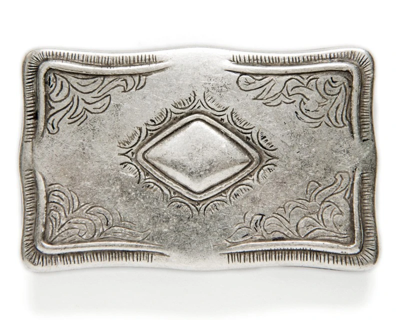 - Incorpora el estilo vaquero en tu día a día, y con cualquier cinturón, con esta estupenda hebilla rectangular de aspecto envejecido con leves ondulaciones en el borde exterior, filigranas grabadas en los extremos y rombo central en relieve.