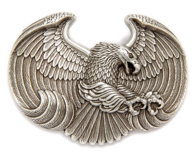 - Podrás lucir una bonita hebilla de estilo motorista que nunca pasa de moda hecha en metal plateado con un águila volando de gran detalle en posición de ataque que conjunta con todo tipo de cinturones.