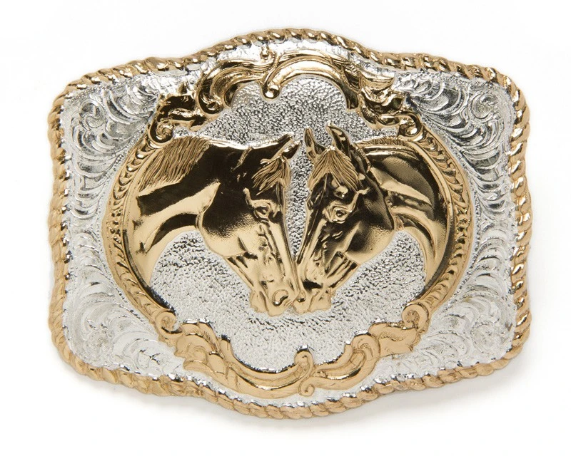 - El mejor cumplido que le puedes hacer a tu cinturón vaquero es colocar esta espectacular hebilla western de estilo rodeo de Crumrine, totalmente chapada en plata y bronce, con la imagen de dos caballos enmarcados observándose detenidamente, decorada con detalladas filigranas y ribete exterior trenzado.