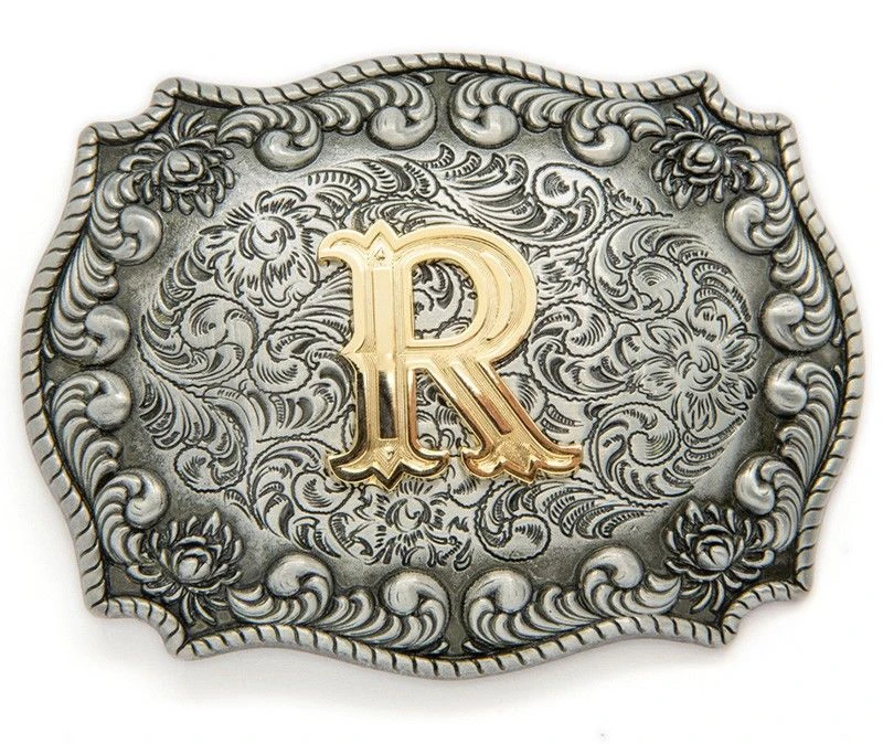 - Por un magnífico precio puedes personalizar tu cinturón con esta hebilla metálica de aspecto envejecido con filigranas grabadas y la inicial R en un bonito relieve dorado.