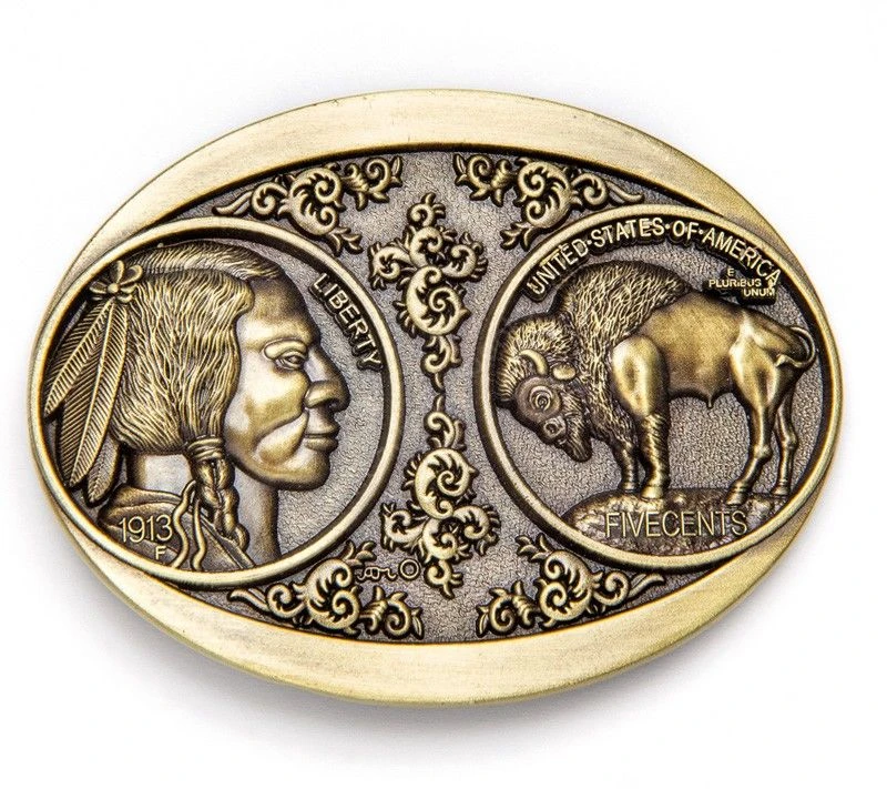 - Llevando esta fantástica hebilla metálica dorada para cinturón también llevarás una pequeña parte de la historia de los Estados Unidos: se trata de una recreación de la moneda acuñada más conocida y codiciada, la llamada buffalo nickel. Esta moneda de cinco centavos de dolar ya fuera de circulación representa en ambas caras la figura de un jefe nativo americano y un búfalo del Oeste.