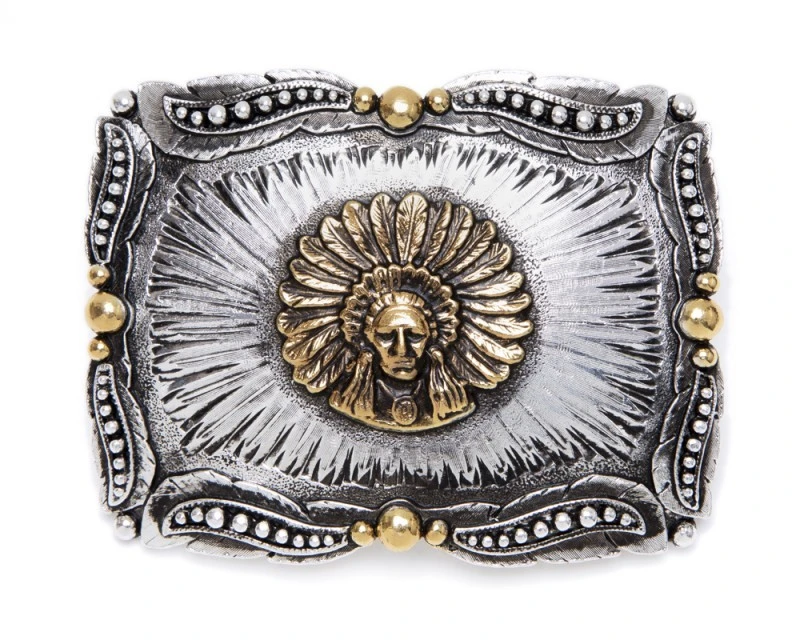 - Hebilla rectangular cowboy con bordes curvados para hombre y mujer hecha con metal plateado de aspecto desgastado, decorada con la efigie de un guerrero nativo de la tribu apache en brillo dorado en un efecto destello visible en el fondo de la pieza. El contorno de la hebilla cuenta con unas perlas también decorativas alternando el brillo plateado y dorado en diferentes tamaños.