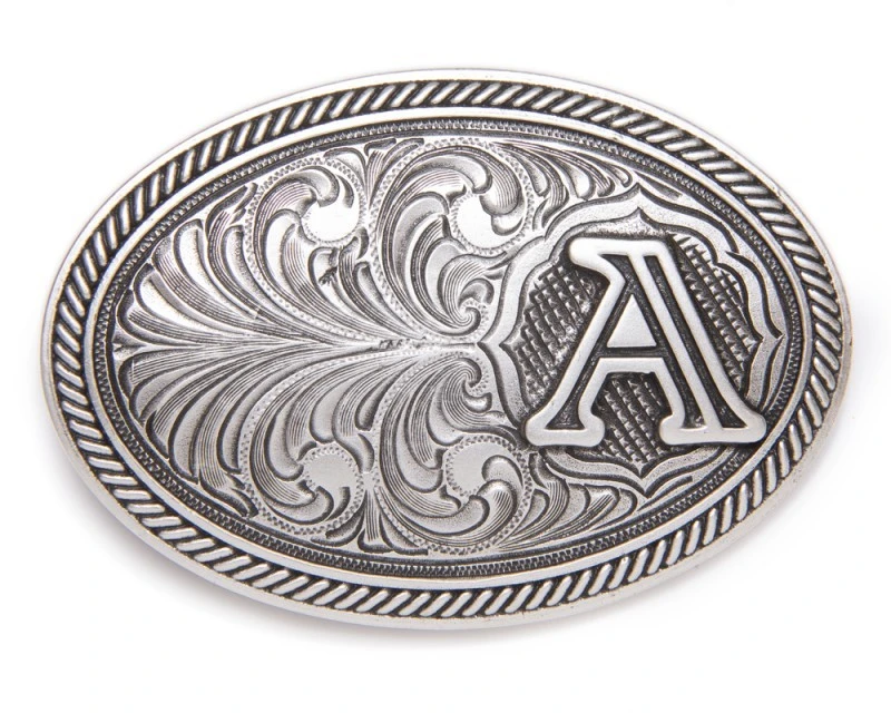 - Hebilla metálica ovalada western de gran grosor para hombre y mujer con borde e interior grabados y en la parte derecha una gran letra mayúscula A en relieve, para todos aquellos amantes del line dance o la moda cowboy que disfrutan con este grado de personalización en su indumentaria habitual o para cualquier ocasión especial.