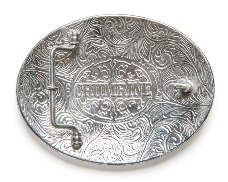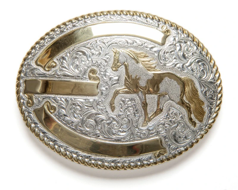 - El mejor cumplido que le puedes hacer a tu cinturón vaquero es colocar esta espectacular hebilla western de estilo rodeo de Crumrine, totalmente chapada en plata y bronce, con la imagen de un caballo al trote, decorada con detalladas filigranas y ribete exterior trenzado.