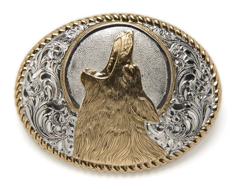 - El nivel de detalle de esta preciosa hebilla western chapada en plata y bronce de Crumrine Silversmiths se sale de lo habitual, con un grabado de grandísima calidad donde se apreciar en todo su esplendor la imagen de un lobo aullando.