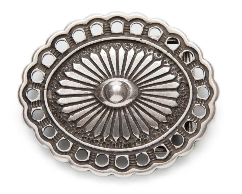 - Hebilla ovalada de metal envejecido en forma de concho vaquero (dibujo en forma de mosaico con círculo central), con el borde ondulado y parcialmente perforado.