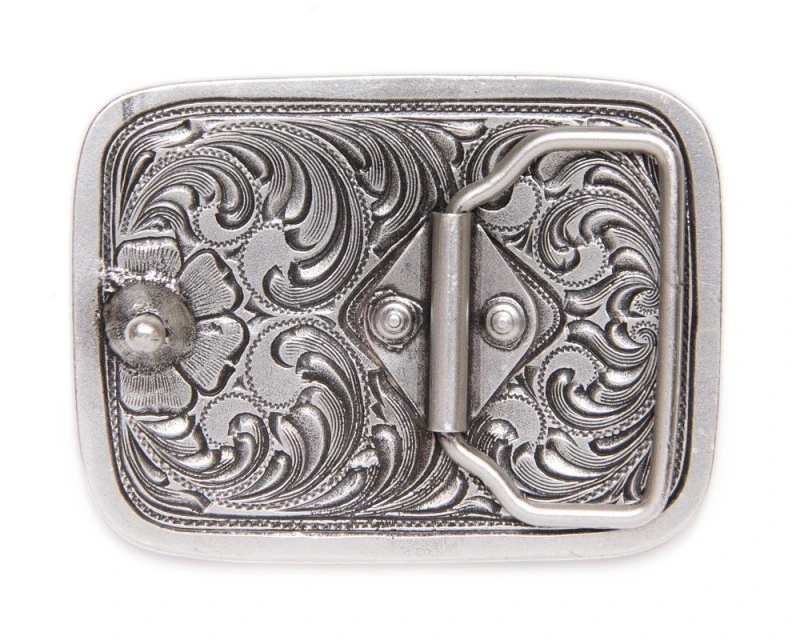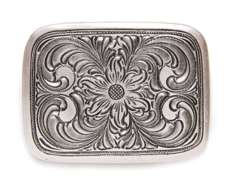 - Hebilla estilo western de tamaño pequeño y forma rectangular en brillo plateado mate para hombre y mujer, decorada con espirales de estética cowboy y una flor grabada en el centro.