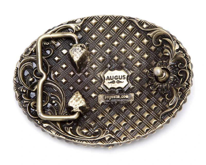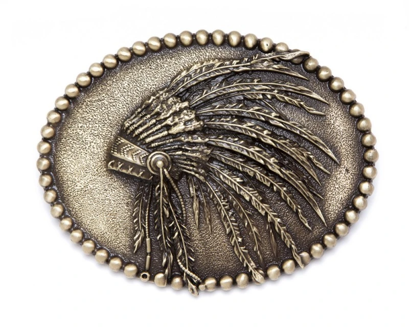 - Hebilla ovalada estilo vaquero para hombre y mujer hecha con latón macizo de aspecto envejecido, decorada con un penacho de guerra indio americano con plumas en relieve y borde exterior esférico.