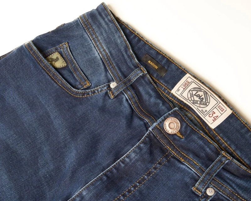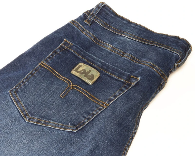 - Pantalones tejanos de pierna amplia para hombre Lois Jeans color azul marino denim, con costura decorativa en los bolsillos traseros y parche pequeño de cuero con el logo estampado de la marca en el bolsillo de atrás izquierdo.