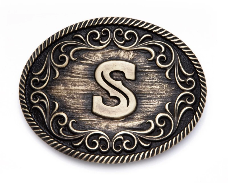 - Hebilla estilo vaquero unisex Montana Silversmiths fabricada en latón de aspecto envejecido con grosor de 0,5 cms., decorada con una gran letra S en relieve y filigranas decorativas que rodean la inicial sobre un fondo más oscuro.