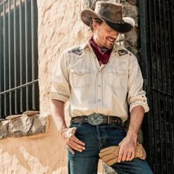 Camisa Western Denim Color Arena Para Hombre Con Mosaicos Tribales Mexicanos