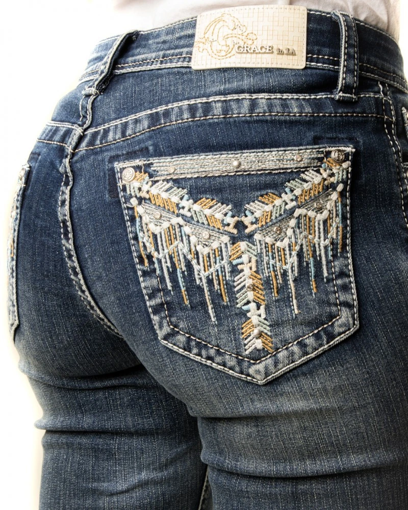 Pantalones Vaqueros Para Mujer Grace In L.A. Con Bordados Nativo Americanos En Bolsillos