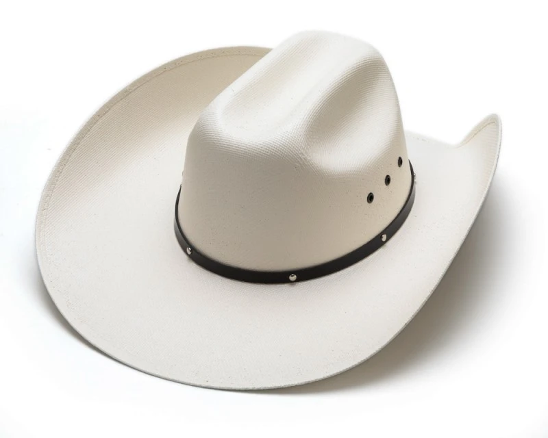 - Sombrero cowboy blanco edición limitada Justin Moore de Bullhide Hats para hombre y mujer, de copa Cattleman baja con ojales negros, hecho con paja endurecida real calidad 50X y cuatro capas de esmaltado que le confieren, además de la blancura acentuada, una gran durabilidad y resistencia a todos los elementos. La cinta decorativa de cuero negro está barnizada y adornada con varios conchos redondos y una pequeña placa metálica en el costado izquierdo con el nombre grabado de dicho cantante country.