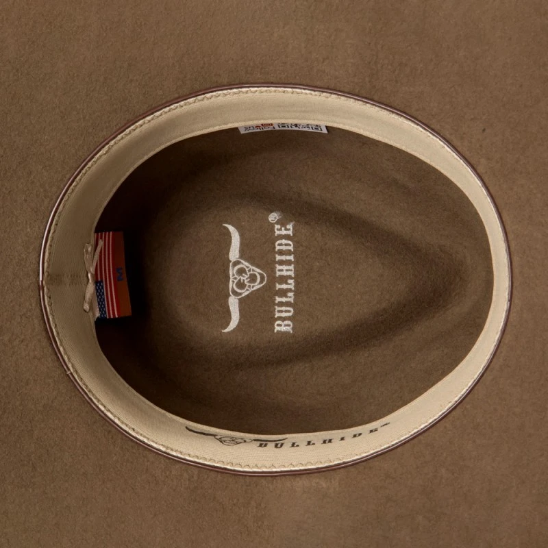 - Sombrero estilo fedora Bullhide Hats de corona clásica Pinch hecho con fieltro blando de lana color caqui, decorado con una trabajada cinta de cuero repujado color marrón oscuro y una chapita metálica envejecida con el logo de la marca en el costado izquierdo.