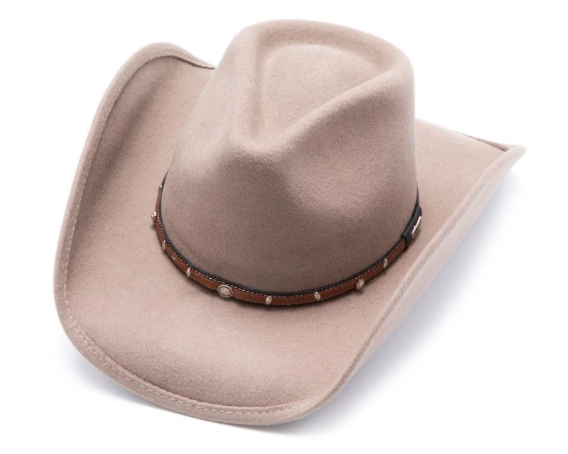 - Sombrero cowboy color arena hecho con fieltro rígido de lana, de ala corta curvada y copa Pinch para hombre y mujer marca Bullhide Hats, decorado con una cinta fina de cuero color coñac con finas muescas y conchos pequeños plateados.