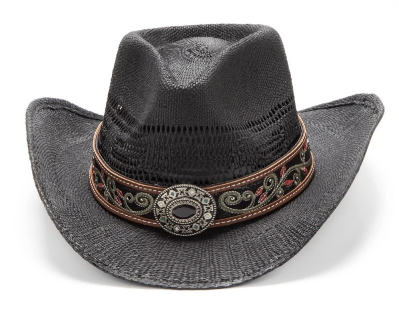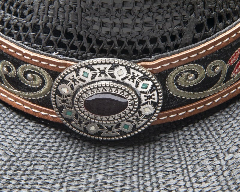 - Sombrero western Stars & Stripes de copa enrejillada Pinch para mujer, hecho con paja trenzada negra de brillo mate y decorado con una cinta ancha de cuero negro y ribetes marrones, adornada con motivos florales bordados en verde y rojo, tachuelas brillantes esféricas y una chapa metálica frontal de estética nativo americana con rombos esmaltados en blanco y azul turquesa y cristal central ambarino.