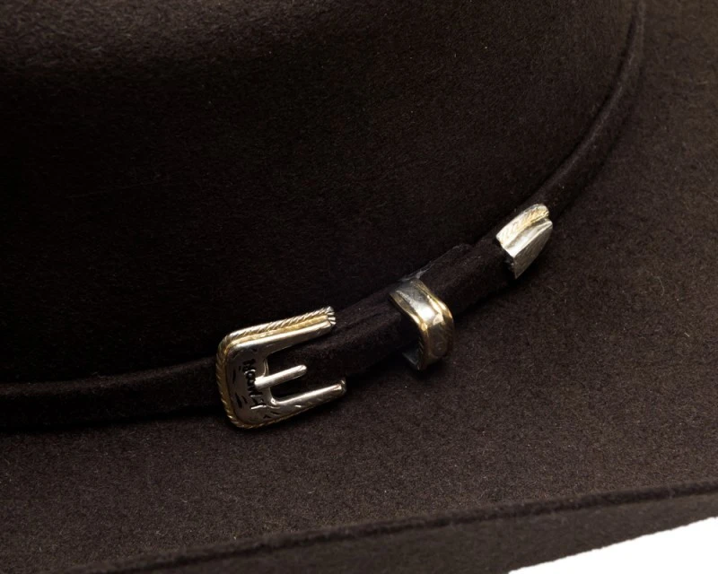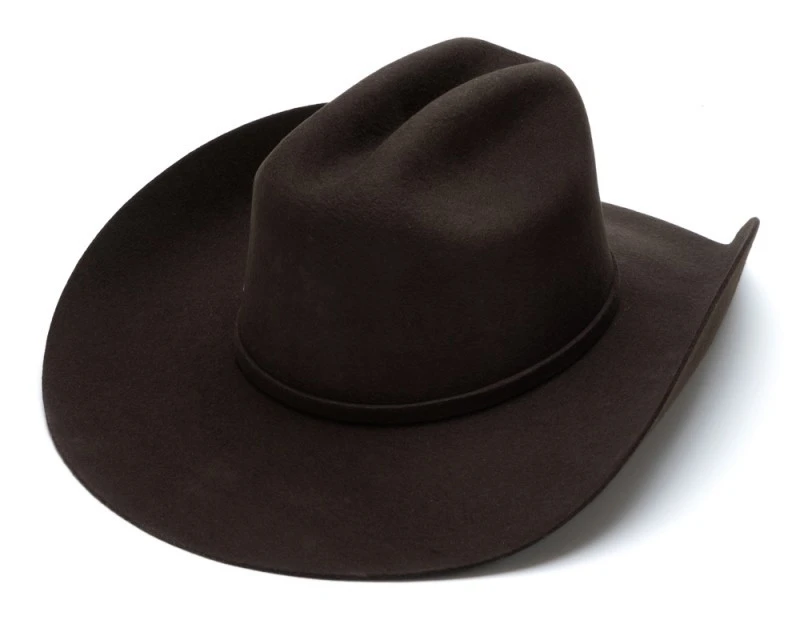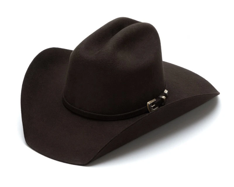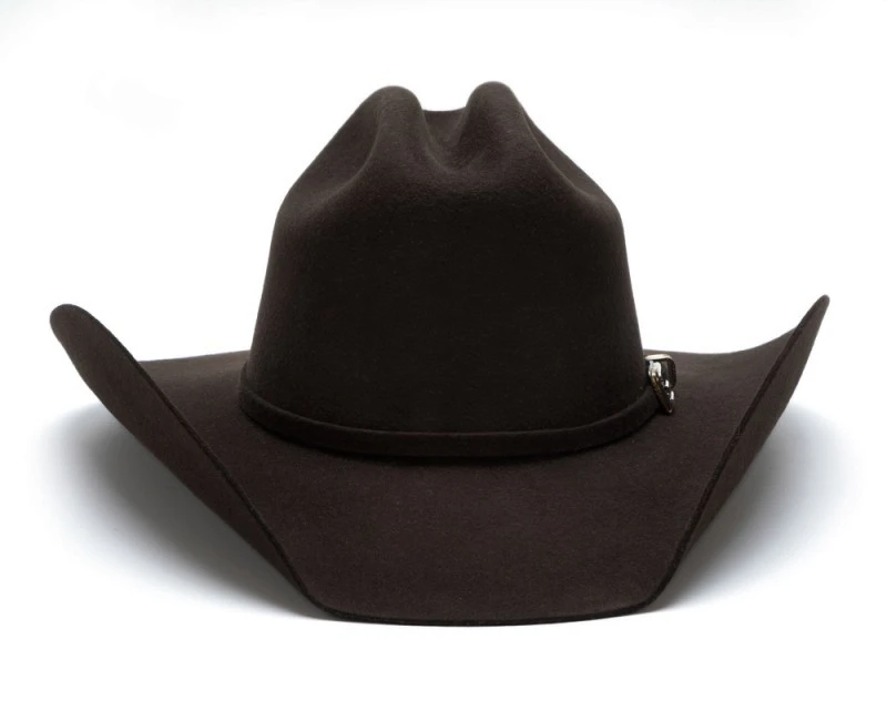 - En colaboración con el reconocido cantante de música country Justin Moore, este exclusivo sombrero cowboy de fieltro rígido marrón chocolate Bullhide Hats con gramaje 6X ofrece una calidad excepcional a un gran precio con el uso de fieltro de lana premium, a la par que un estilo tradicional y elegante, con su copa de sombrero estilo Cattleman y una fina cinta en fieltro del mismo tono decorada con una hebilla en tono plateado y detalles desgastados.