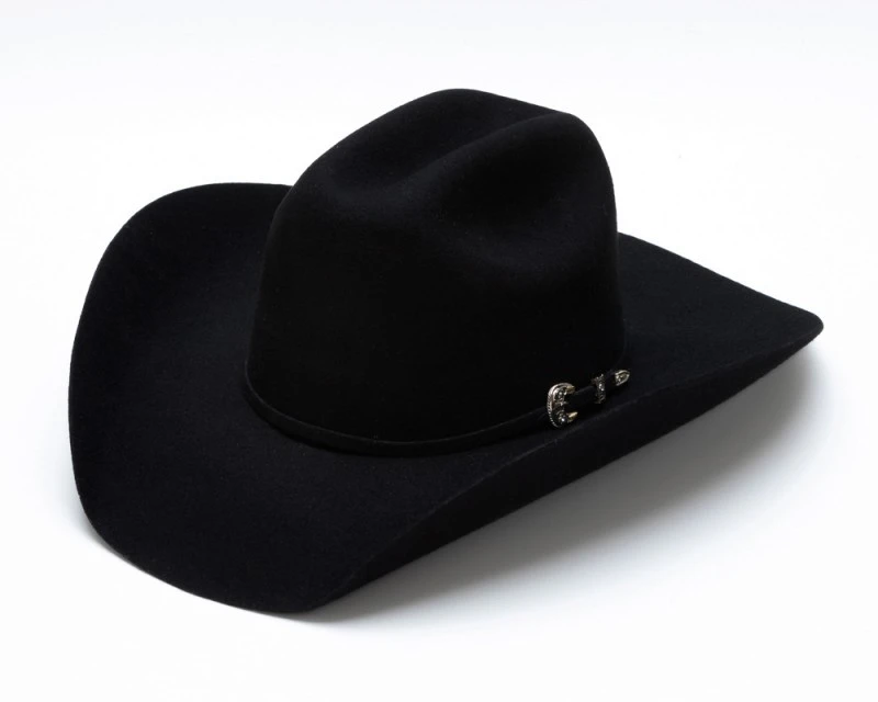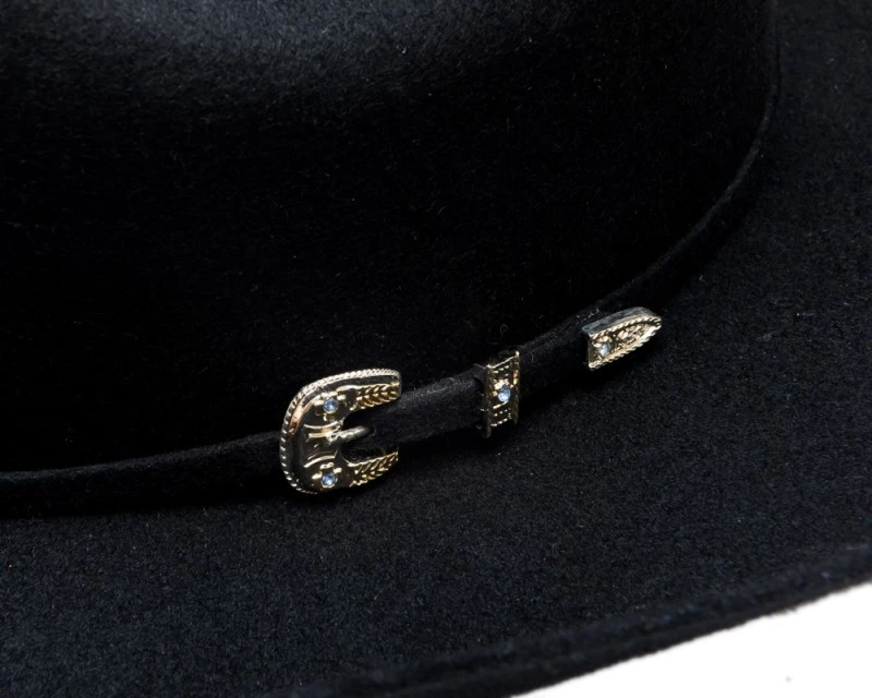- Sombrero texano de fieltro de lana rígido negro calidad 4X fabricado por Bullhide Hats para hombre y mujer, con copa Cattleman ligeramente baja y decorado con una cinta a juego de fieltro negro con hebilla metálica de tres piezas con brillo plateado y dorado, y con un pequeño cristal incrustado en cada una de las piezas.
