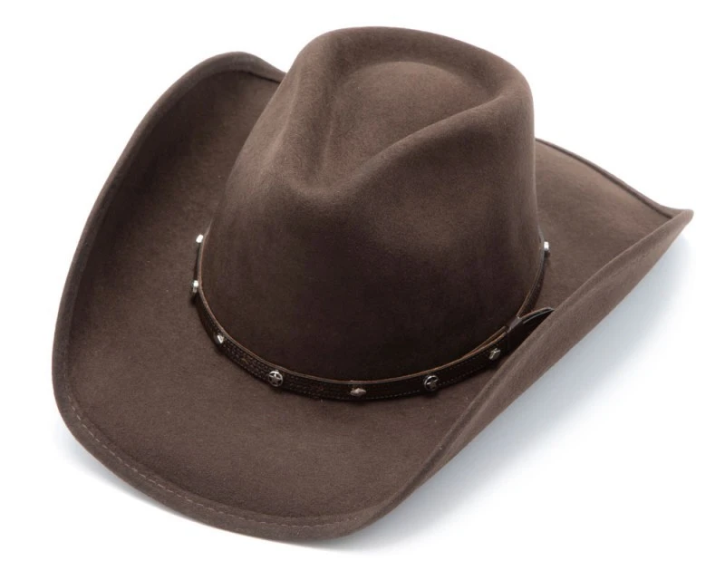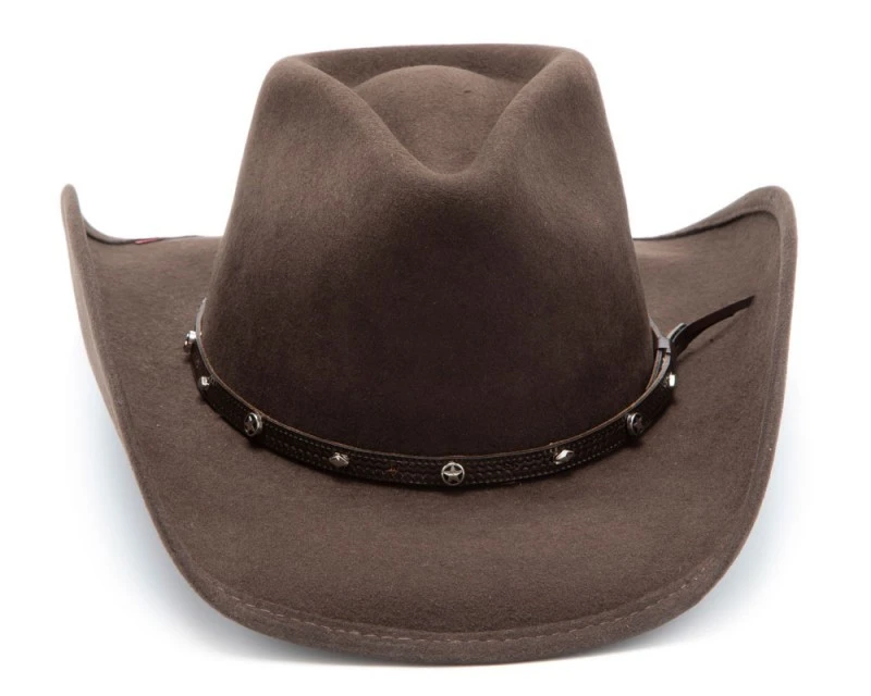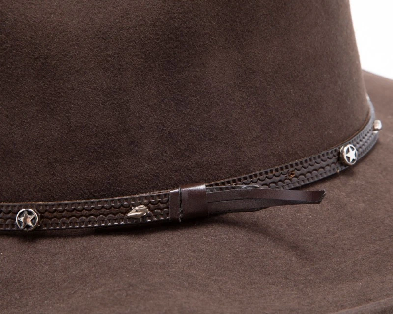 - Sombrero cowboy marrón hecho con fieltro rígido de lana, de ala corta curvada y copa Pinch para hombre y mujer marca Bullhide Hats, decorado con una cinta fina de cuero también marrón donde lucen pequeños conchos redondos con estrellas vaqueras y rombos.