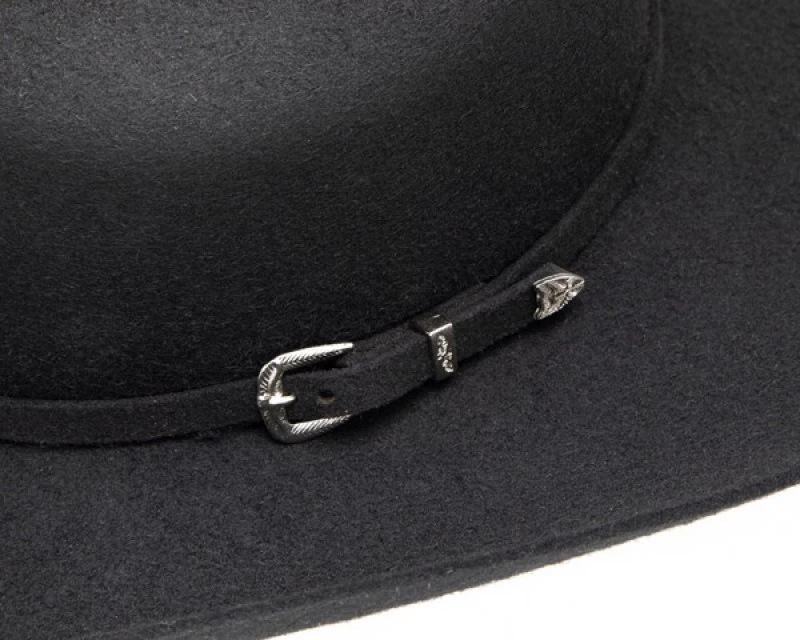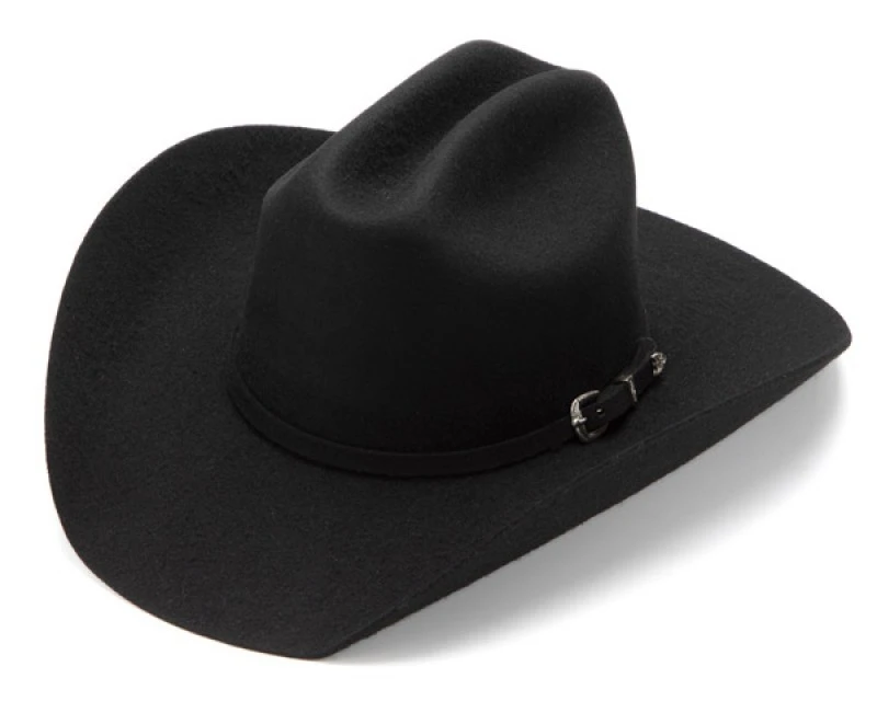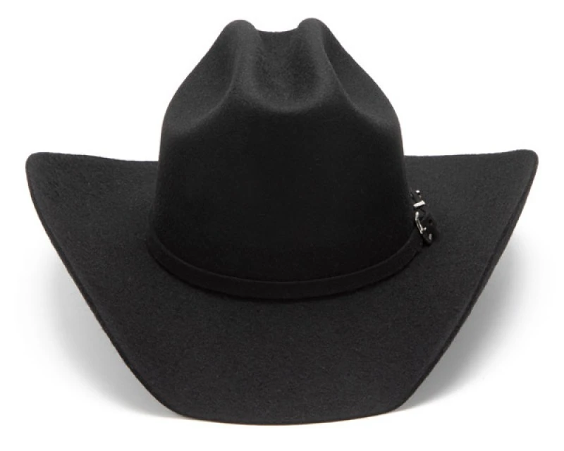 - El diseño de este sombrero muestra los orígenes y necesidades del mundo vaquero: copa alta Cattleman, alas curvadas y cinta a juego también de fieltro negro con hebilla brillante, para vestir de forma elegante y que cumpla su cometido principal resguardándote del sol y el viento.